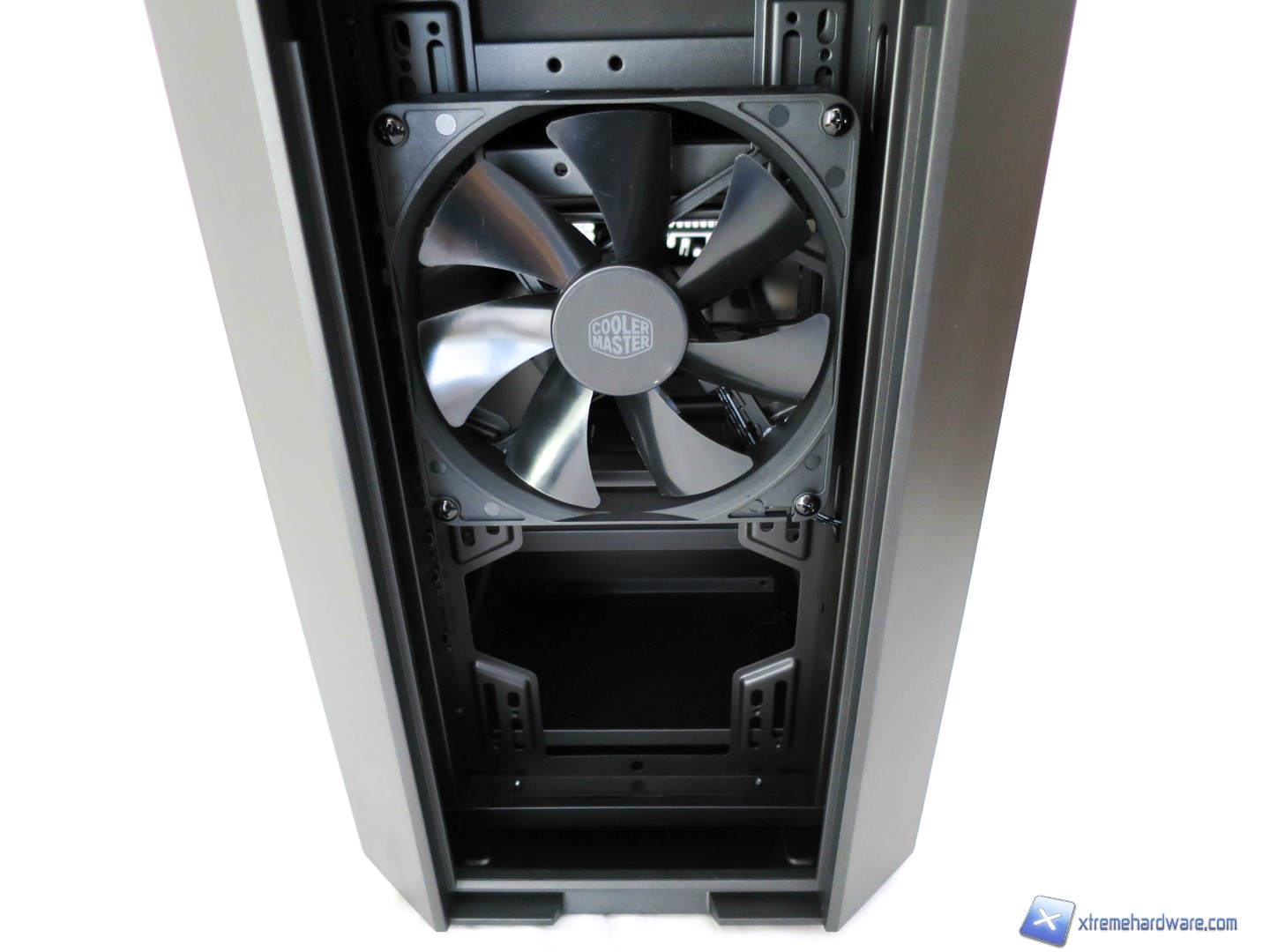 Rimossa la griglia potremo finalmente accedere al vano delle ventole. Cooler Master ha scelto una struttura in metallo per sorreggerle, inoltre non troviamo fori standard perlomeno non per i modelli da 120mm. Per il modello preinstallato da 140mm troviamo fori standard che ci permetteranno di installare due ventole da 140mm o all’occorrenza rimuovendo quella preinstallata da 140 così come gli slot superiore potremo montare fino a tre ventole da 120mm o 140mm grazie ed anche al supporto in bundle da installare nella parte superiore interna. Il MasterCase 5 è un case votato, come detto più volte, al DIY ed al Modding e come vedremo a seguire avremo diverse possibilità di installare radiatori e ventole e dunque creare un sistema a liquido customizzato.