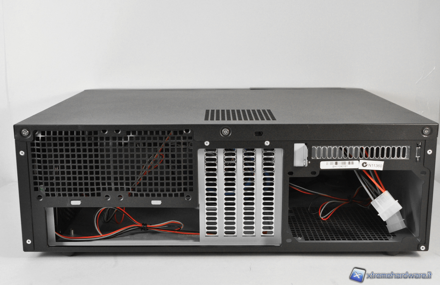 Sul retro, partendo da sinistra verso destra, troviamo nella parte alta una griglia di espulsione dell’aria calda proveniente dall’interno del case. In questa griglia, volendo, si possono installare ventole da 80cm e in questo caso SilverStone consiglia le sue SUSCOOL 81, ventole termo controllate. In questa griglia non troviamo nessun filtro anti-polvere. Di fianco troviamo i 4 slot d’espansione, più che sufficienti in un sistema HTPC. Considerando, infatti, che la scheda video possa occupare uno o al massimo due slot, ne avremo comunque almeno altri due disponibili per installare una buona scheda audio o introdurre altre schede. Infine, più a destra, troviamo il vano che ci consente di installare un alimentatore ATX.