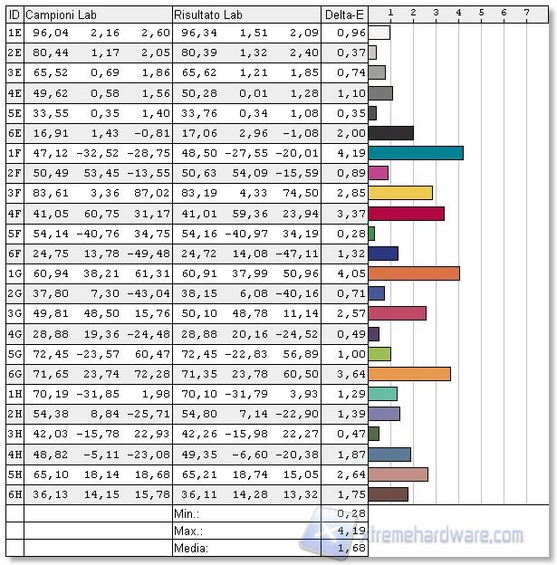 La fedeltà cromatica ora ottiene valori soddisfacenti, con una media del Delta-E di 1,68, ma ipotizzavamo un valore migliore.