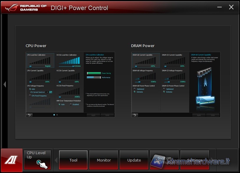 Grazie al solido sistema di alimentazione DIGI+ che accompagna la Rampage IV Formula come tutta la serie ROG, si può agire anche tramite l’interfaccia software Asus DIGI+ regolando il livello del Load-line Calibration, molto importante per rendere quanto più stabile possibile l’erogazione della tensione alla CPU anche in presenza di forte assorbimento. Altro tool fondamentale per effettuare l’overclock del sistema senza dover ogni volta riavviare e rientrare nel bios, è il conosciutissimo TurboV EVO che vi mostriamo di seguito: