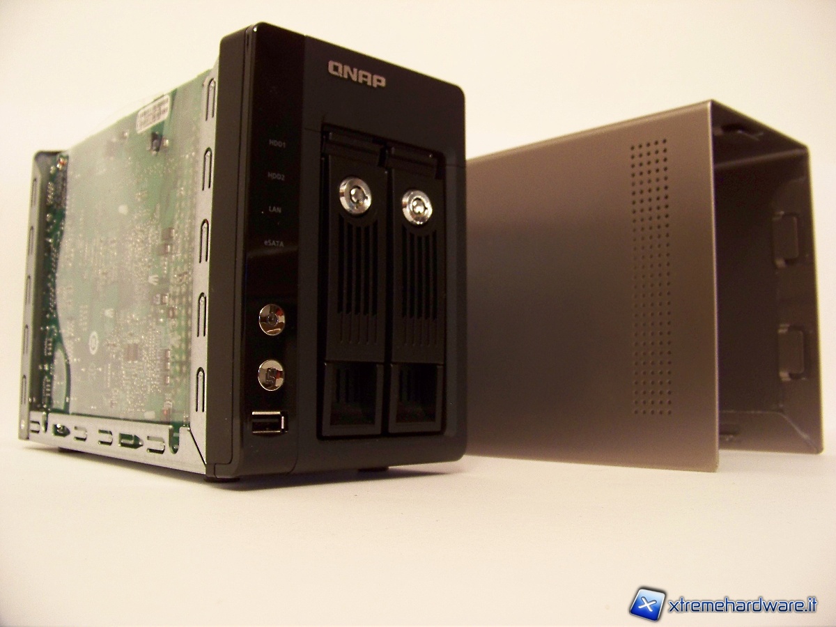 Nel pannello frontale sono presenti il tasto di accensione, un tasto per la copia veloce da USB, una porta USB 2.0 e quattro spie luminose, due per gli hard disk, uno per l’attività LAN e una per l’eSATA.